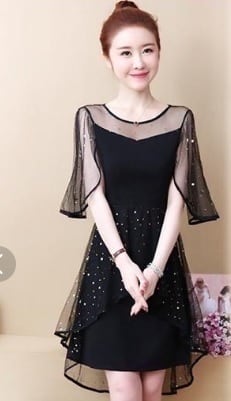 チュール黒のフィッシュテールワンピです。黒のチュール地に小さな星のスパンコールをちりばめています。上地のチュールが前と後ろで丈の異なるフィッシュテールになっていて、デザイン性のあるスタイルがとても魅力的な一着です。前の丈は短めになりますが、下地が黒のジャージ素材で前後同じ長さなので全体的に膝丈タイプに見えます。またウエストはゴム仕様なのでサイズ的にもゆとりをもって着用頂けます。素敵なデザインで全体的に優しい感じに仕上げられています。ファスーなしのかぶるタイプ。