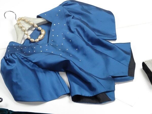 サテンのブラウスとベルベットのロングスカートのセットアップ。ブラウスは五角形のペンタゴンネック。胸元に小さなビーズを散りばめています。広い袖とスペンサージャケットタイプの裾のデザインが優美な印象に。スカートはサイドがゴム仕様で深く艶のある緑のロングベルベット。気品ある一着です。スカ-ト裏地あり。スカートバックファスナー。ブラウスは背中ボタン留め。