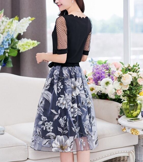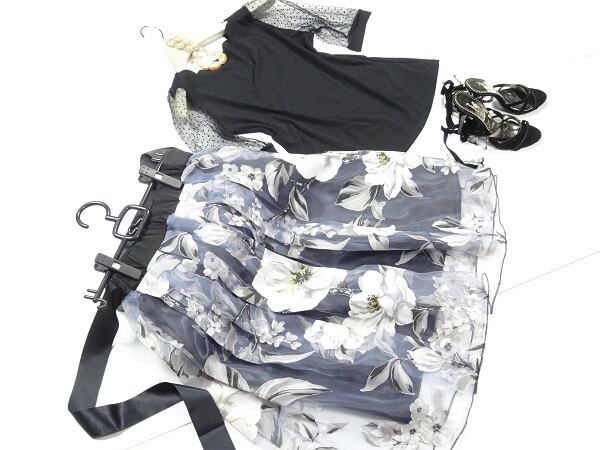 ブラウスと花模様のスカートのセット。ブラウスの身頃部分は柔らかな黒のジャージ素材。袖は透け感のあるオーガンジーに小さなドット柄をプリント。いくつかの丸みのある襟ぐりがキュートさをプラスしています。スカートはオーガンジーの上地にシックな花模様をプリント。ウエストの黒のサテンのリボンがアクセントに。ピュアでエレガントな印象の一着です。ファスナーなし。スカートはウエスト総ゴム仕様で伸縮性があります。裏地有。