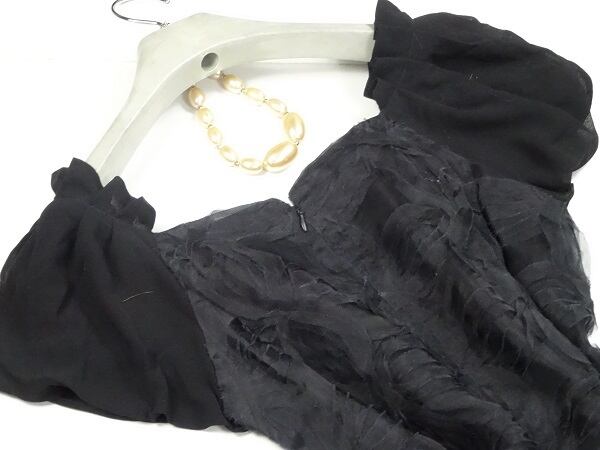 フリルが優雅で可愛らしいワンピースです。ウエストから下のスカート部分は6段のたっぷりとしたフリル仕様になっていて大変綺麗。エレガントで可愛い一枚です。裏地付。背中ファスナ-有。