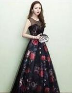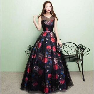 花柄チュールのパーティ-ロングドレス。しっかりした黒地の生地に大柄な模様をプリントし、黒のチュールで全体をおおった豪華なつくり。チュールのみのデコルテラインが美しく映える、ゴージャスで上品なテイストをかもしだしている一着です。背中ファスナ-有。胸パット付き。裏地有。