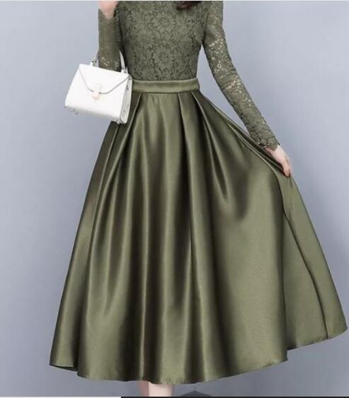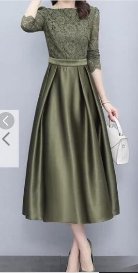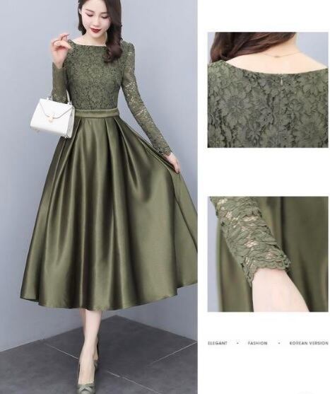 シックなレースとサテンのワンピース。トップスと袖にはレースをあしらい、胸元はすっきりとした浅いU字ライン。袖先は平ではなくレースの模様を生かしたカットになっています。ウエストから裾にかけては光沢のあるサテン地を使い、気品に満ちたとてもエレガントで上品なひとクラス上をいく一品に仕上げています。Sサイズですがウエストは約70cmとゆったりしています。裏地有。背中ファスナー有。
