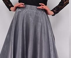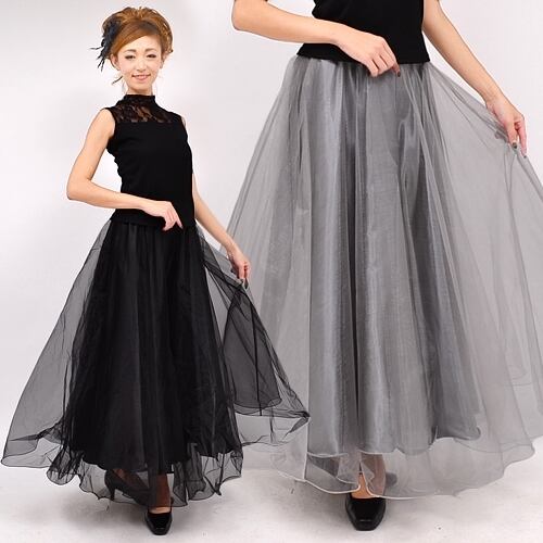 ステージフレアロング丈オーガンジーのスカート。艶やかなサテン地の上にオーガンジーをかぶせた華やかな一着。歩く度にふんわりと揺れる裾が視線を集めます。後ろファスナー。裏地付。