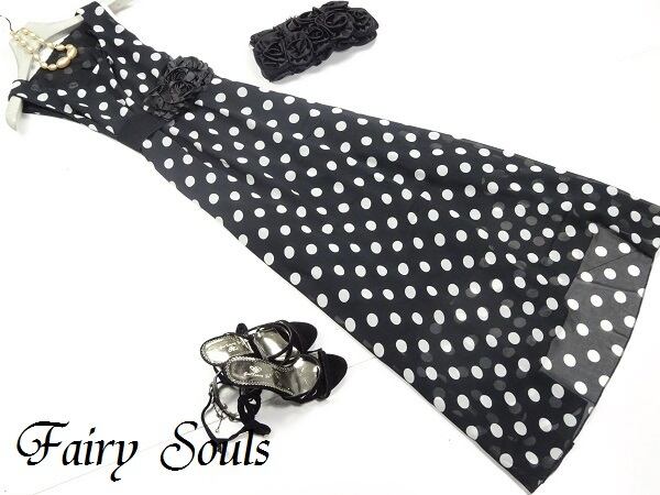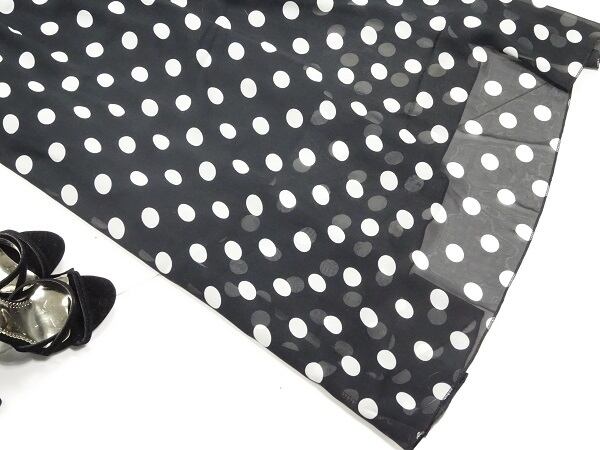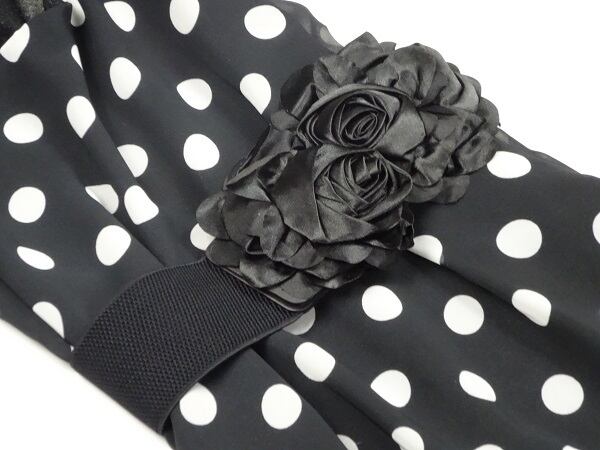 黒地ドット柄花飾りベルト付ワンピース。楊柳クレ-プのさらさらとした手触りのシルクが涼しげです。さらっとした黒地のシフォン地に大きな白のドット柄をプリント。やさしいラウンドネックに、ウエストには取り外し可能な幅広ゴム仕様のベルト。薔薇コサージュ風の飾りが付いて華やかな印象に仕上がっています。ほんのりとした透け感が魅力的な一着です。ウエストは絞っておらず、ベルトを外すとふんわりと裾まで広がるデザイン。ファスナーなしのかぶるタイプ。黒色裏地付。