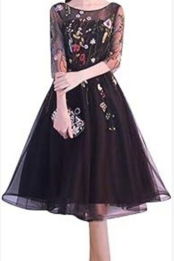 花刺繍膝丈チュ-ルパ-ティ-ドレスです。深いネイビ-のサテン地の上に、ネイビ-の花刺繍をほどこしたチュ-ルが重ねられた豪華でフェミニンなデザイン。デコルテラインから肩にかけての透け感が大人の雰囲気を醸し出し、シックで上品な女性を表現。背中は腰下まで編み紐掛けなので、紐の締め具合でサイズ調整が可能です。パーティやイベント、コンサート、結婚式にと、さまざまシーンで活躍してくれる美しい一着。背中編み紐掛け。ファスナーなし。胸パット付。