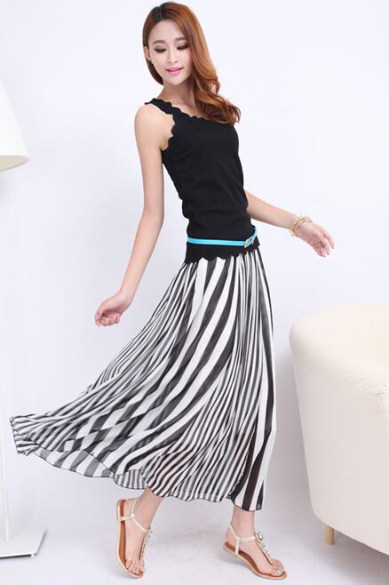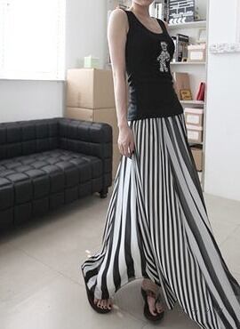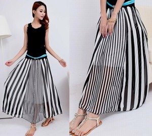大人テイストのストライプ柄ふんわりシフォンマキシ丈スカートです。ウエストはゴム仕様ですので長時間でも楽に着て頂けます。裏地付ですが、透け感がありますので、インナー着用をお勧めします。
