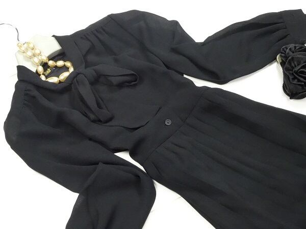 素敵なデザインのフォ-マルワンピ-スです。プリ-ツ仕立てでさまざまなシーンで活躍してくれる一着です。裏地あり。ファスナ-なし、前ボタン有。