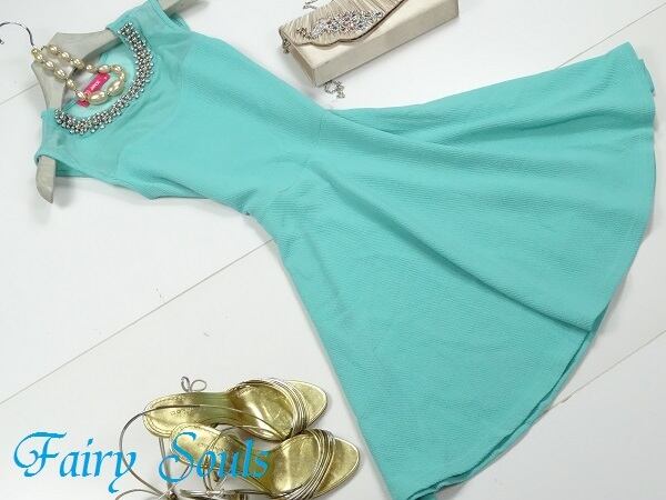 襟もとに大小のビジューがふんだんにあしらわれたワンピース。胸もとから肩にかけての透け感が爽やかさと品の良さを印象付けています。シンプルだけれど存在感にあふれたデザイン。デートやお呼ばれ、ライブやパーティなど、様々なシーンで活躍してくれる一着です。サイドファスナー。裏地なし。