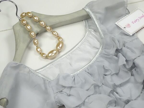 エレガントで胸元のフリルで華やかさが増しています。ウエストから広がるラインもとても可愛らしいです。右脇下ファスナー有。裏地付。