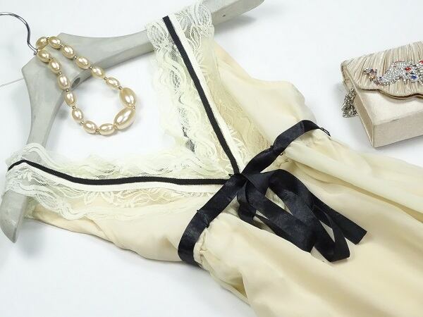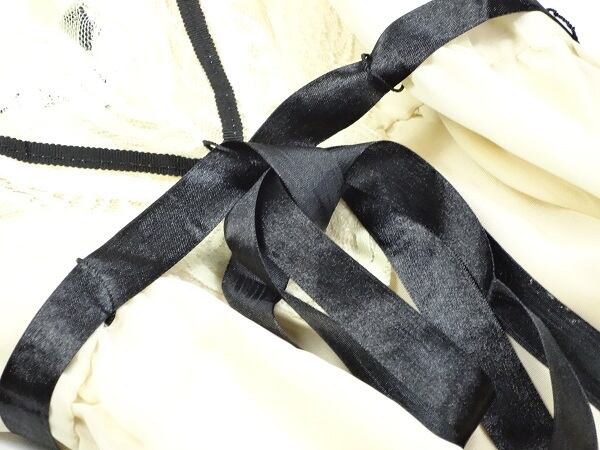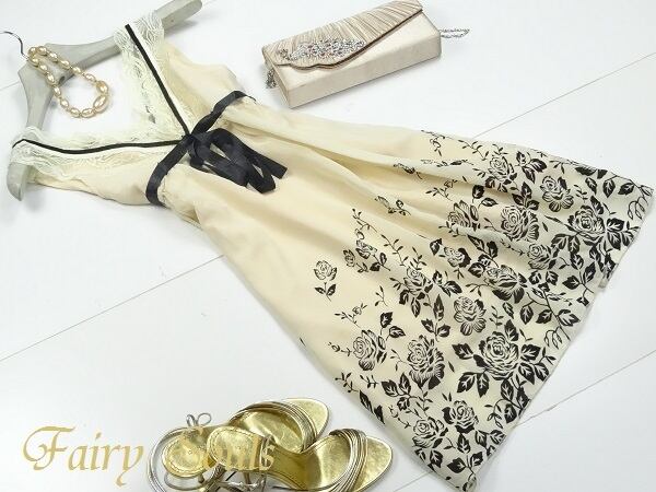 薔薇模様のフロッキープリントのシフォンワンピースです。襟元レースと、胸もとリボンが素敵なデザインです。ファスナーなし。裏地付。