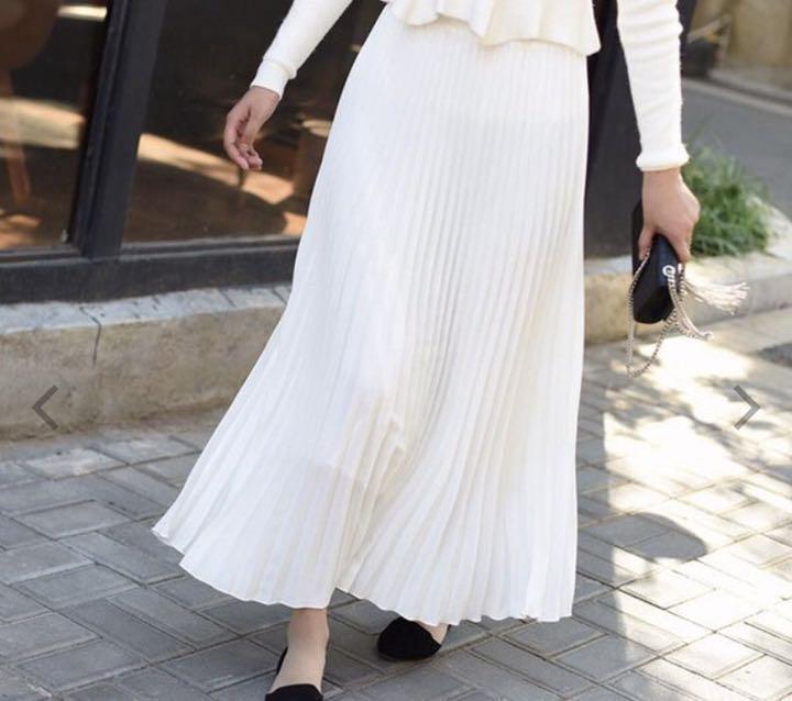 とろみ素材白のプリーツスカ-トです。光沢のある柔らかい生地使用でベ-シックなデザインですが女性らしさUP!。風に優しくなびき、歩くたびに着る人の足元を美しく見せてくれる一着です。ウエストはゴム仕様なのでサイズ的にゆとりをもって着用頂けます。ファスナ-なし。裏地付。