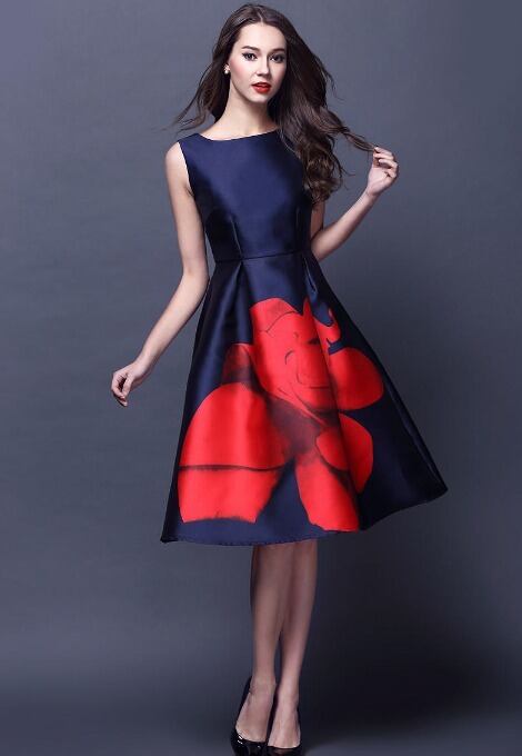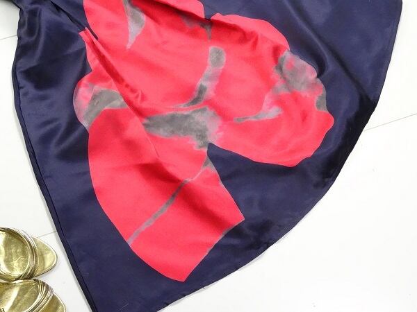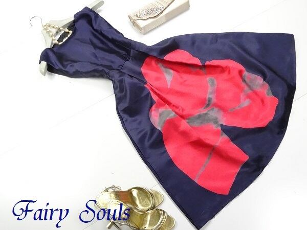 大花柄サテンワンピ-スです。色も鮮やかで生地も高級感があります。セレブなデザインです。シンプルな飽きのこない着まわせる一着です。裏地有。背中ファスナ-有。