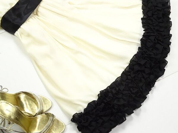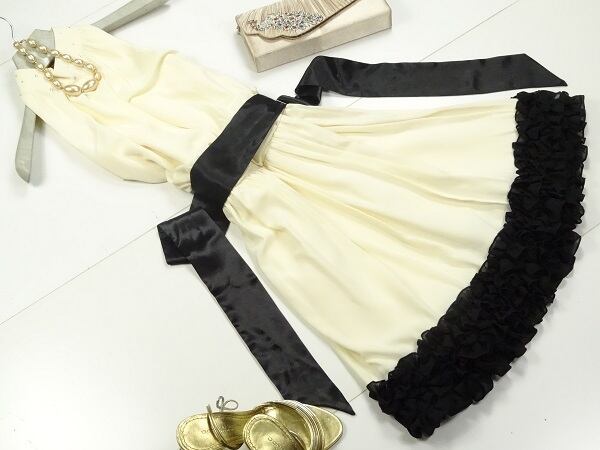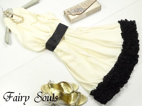 キュートなシフォンのショート丈のワンピースです。アメリカンノースリーブタイプで裾のフリルがとても素敵です。ネック部分にはラインストーンが施されサテンのリボンも素敵です。裏地付き。背中ファスナー有リボン付。