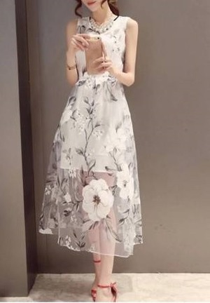 花模様のレース仕立ての膝丈ノ-スリ-ブワンピース。白の下地の上に、大きな花模様を刺繍したレースをかぶせていて、薄い透け感がやわらかな印象を与えてくれています。大きなラウンドネックにノースリーブも全体の中でバランスが良く、ピュアでフェアリーなデザインになっています。煌めく太陽の光の中でも、また新緑の爽やかな風の中でも、着る人を美しく魅せてくれる一着です。裏地有り。背中ファスナー有。