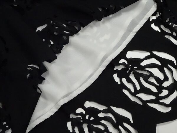 上品で優しいバラモチーフの透かし彫り花柄ワンピ-ス。トップスのゆるやかな襟ぐりには黒のビーズをちりばめ、間に見える白のビーズがきらきらと輝いています。ウエスト切替で、スカート部分には白地の上に薔薇の透かし彫りを施した黒のシルク地をかぶせ、シックな中に豪華な印象に仕上がっています。デートやイベント、結婚式の二次会にと、幅広いシーンで着用頂けます。左脇ファスナー。裏地有り。
