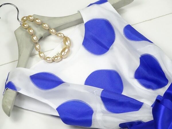 大きなブルーのドット柄が目をひくロング丈のワンピース。白の下地の上に、大きな水玉がプリントされたオーガンジーがかさなっているため、水玉が立体的に見えるユニークなデザイン。サテン地のウエストリボンベルトでシンプルなラインにアクセントをつけています。左サイドファスナー。裏地あり。
