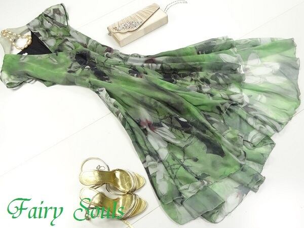 大きな花模様がプリントされたシックなワンピース。裾の後部分が長くなっている不規則な丈の品の良いセクシー感をかもしだしているエレガントな一着です。ウエストを共布のベルトリボンでキュッと絞るデザイン。シックでやさしくエレガントな一着です。裏地有り。背中ファスナー有。布ベルト付。