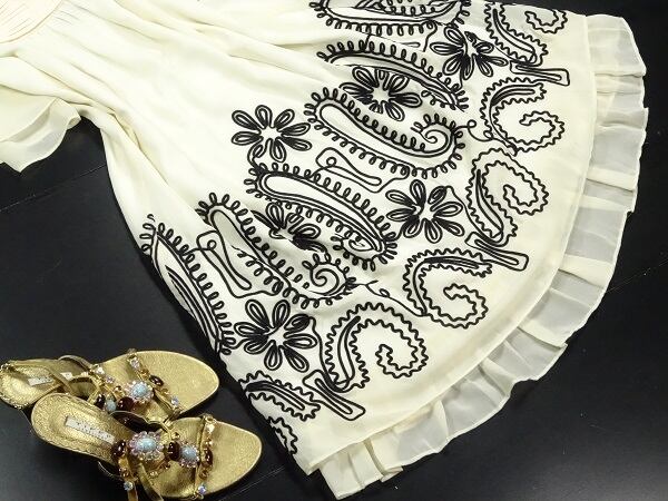 ペイズリ-のコ-ド刺繍が凝っていて、キュ-トな印象で、ふわっと広がるフレア-が美しいシフォンワンピ-ス。襟元などのちょっとしたデザインも凝っていて、お洒落感アップな一品です。裏地有。