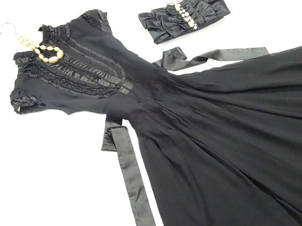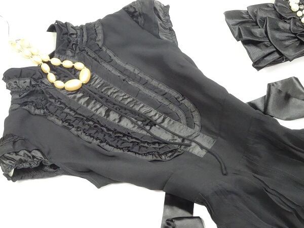 配色がとても美しいエレガントなワンピ-スです。デザイン性のあるスタイルが魅力的。胸元のフリルがとても豪華です。裏地あり。左脇下ファスナ-有。