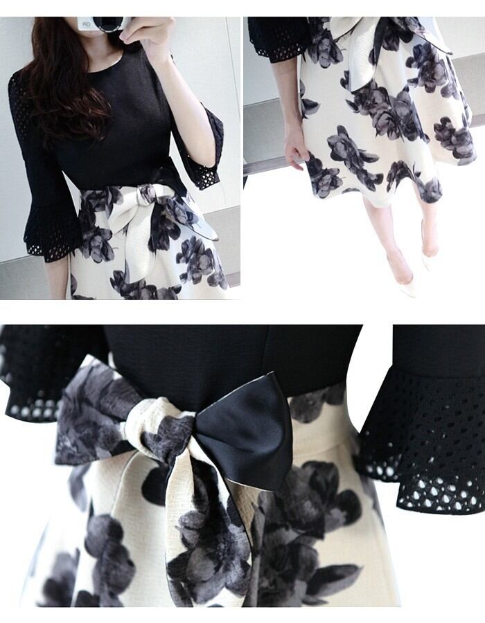 とても優美かつ綺麗な膝丈フレア-ワンピ-スです。ウエストから裾にかけてはたっぷりと生地を使用したフレア。袖のレ-スが女性らしいエレガントでフェミニンな一着です。背中ファスナ-有。裏地付。リボンベルト付。