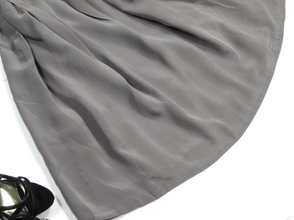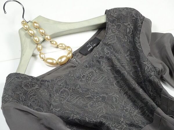 レースとウエストタックのツーピース風ワンピース。上半身は繊細なレース仕様。ハイウエストにはタックをとり、トップスとボトムのセットに見えるデザイン。落ち着いたグレーに上品なテイストをプラス。品の良い可愛らしい一着です。背中ボタン留め。脇下ファスナー。裏地あり。