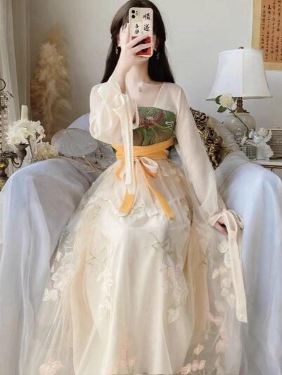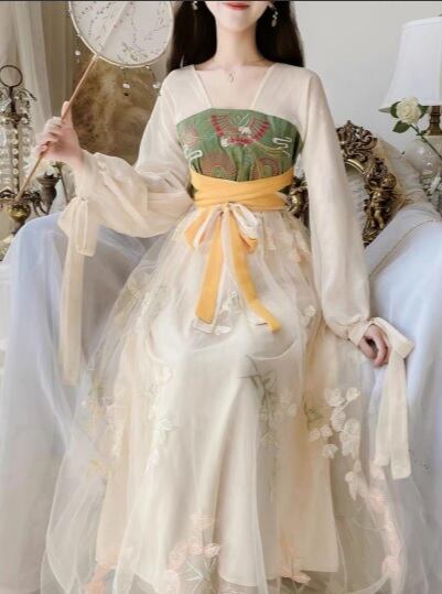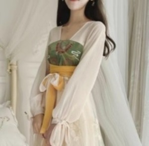 東洋的な魅力あふれるレース刺繍のロングドレス。シャンパンゴールドカラーの下地の上に白や若草色の糸を使用した刺繍をふんだんにあしらったチュールを重ねています。胸元は緑の布に雲や毬のような和風の刺繍が施され着物の帯をイメージさせるデザインになっていて、脇の両サイドに縫い付けられたからし色と白のウエストリボンを前できゅっと結べば、可愛いアクセントになり、少しゆったりめのウエストにめりはりがつきます。また薄いシフォンの長袖の袖口には長いリボンがついていて、天女の羽衣のような優しさをかもしだしています。ドレスでありながら和の雰囲気を感じられるとても美しいデザインです。背中ファスナー有。裏地あり。