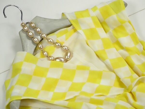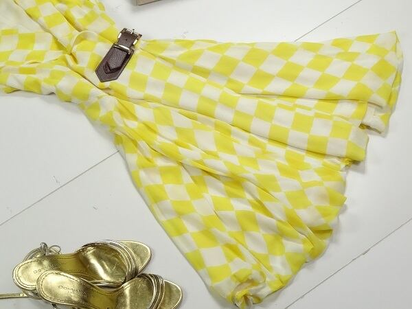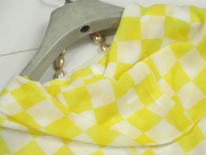 チェック柄フード付きカシュクールワンピース。白と黄色のチェック柄を全体にプリント。前で合わせるカシュクールタイプ。ボタン等はなく、ウエストをベルトで締めるデザイン。首元はフードになっていて意外性があります。フードをおろすと一見普通のワンピース。フードをかぶるとかわいらしさがアップする素敵な一着です。ファスナーなし前合わせ。裏地あり(表地と縫い合わさった一体型)。