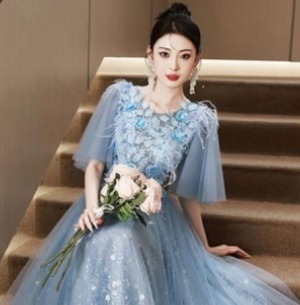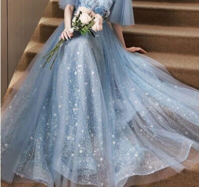 ビーズ刺繍とチュールのワンピースドレス。水色のサテン地の上に、胸元には白と青のスパンコールとビーズをあしらった同色のチュールを、スカート部分にはボタニカルと小さなドットをプリントした同色のチュールを重ねた華やかなデザイン。袖のチュールが気になる二の腕を隠してくれます。背中はヒップまで編紐掛けになっているので、紐の締め具合で、商品説明に記載のサイズより若干ゆとりをもって着用いただけます。パーティやライブ、イベント、結婚式など、どんなシーンでも活躍してくれる一着です。裏地なし。背中編み紐掛け。ファスナーなし。胸パット付き。