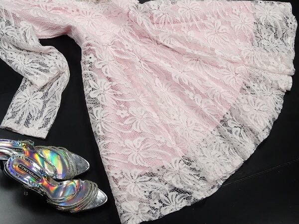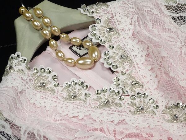 胸元のビジュ-飾りがとても豪華でお顔を華やかに見せてくれます。全体的にサテン地の上からレ-スが被せられたとても豪華で上品な一着で女性度UPです!!結婚式やパ-ティ-にバッチリです。とてもエレガントな素敵な一着です。裏地付。背中ファスナ-有。