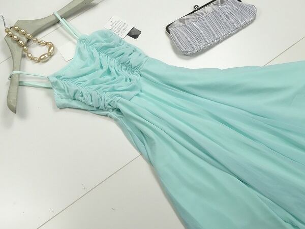 裾の丈が不規則なエレガントで女性度アップパ-ティ-ドレスワンピです。動いた時の裾の揺れ感がとてもセクシ-注目度抜群です。裏地あり。ファスナ-なし。