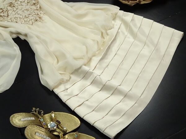 ウエスト切替胸元豪華ワンピースです。ザクッと着るデザインです。ふんわりとした優しく上品なイメージを与えてくれます。胸元がとてもエレガントで斬新なデザインが目を引き素敵です。裏地付。背中ファスナ-有。