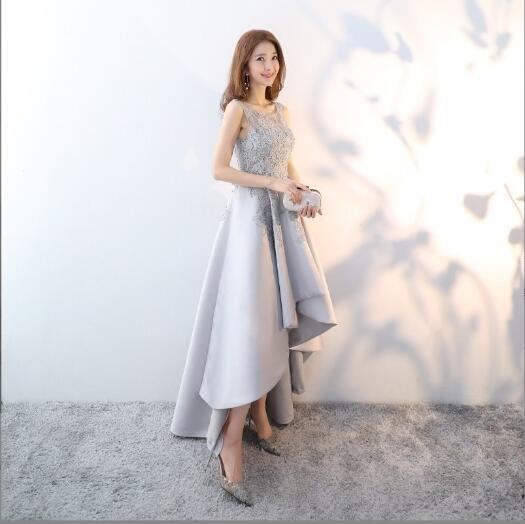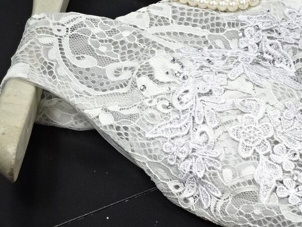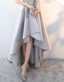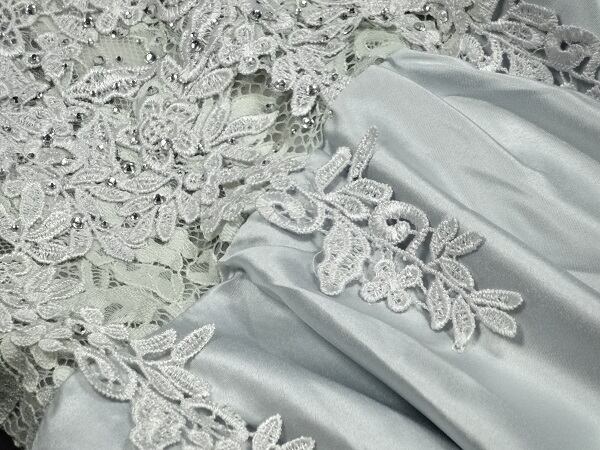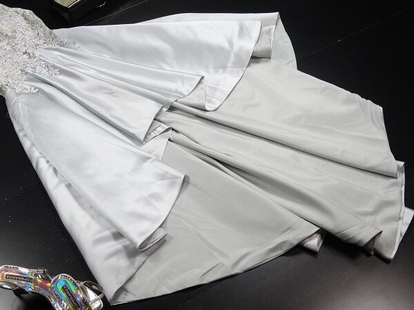 フィッシュテ-ルのロングドレス。光沢のあるシルバーグレーのサテン地をふんだんに使用。トップス部分にはシルバーの糸で立体刺繍をほどこし豪華な印象に。前と後ろで長さの違うフィッシュテ-ルのデザインがとてもエレガントで魅力的。パーティやコンサート、結婚式の二次会にと、様々なシーンで活躍してくれる一着です。裏地有。背中ファスナ-有。胸パッド付。