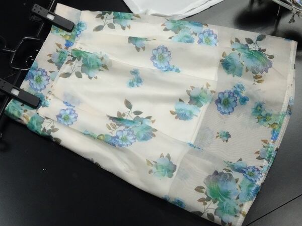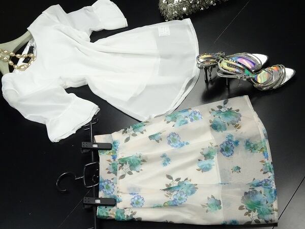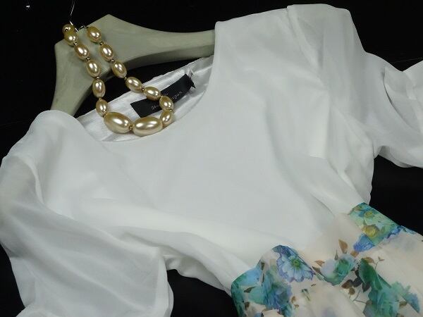 トップスが涼しげでスカ-トも花柄で夏らしい上品な2点セットです。スカ-トは後ろのみウエストゴムになっています。裏地あり。スカ-トサイドファスナ-有。