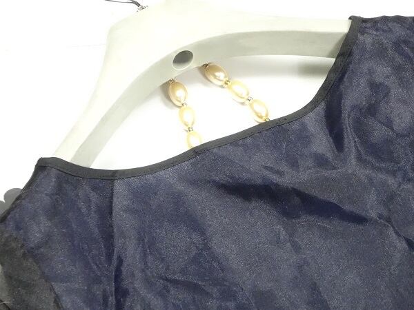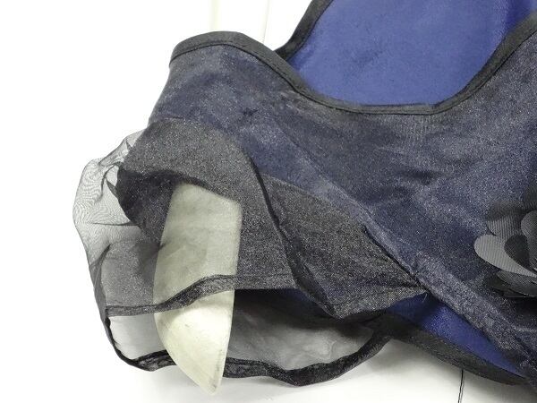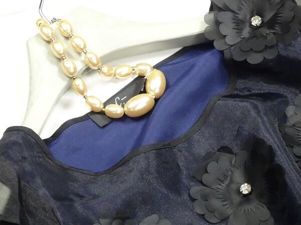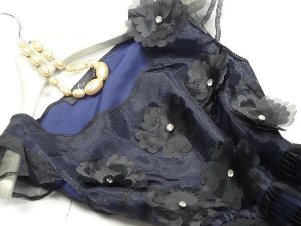 ファッション性に優れ高級感のあるワンピ-スです。斬新なデザインも目を引きます。胸の花飾りとスカ-ト部分のプリ-ツがとても女性らしい素敵な一着です。左脇下ファスナー有。裏地有。