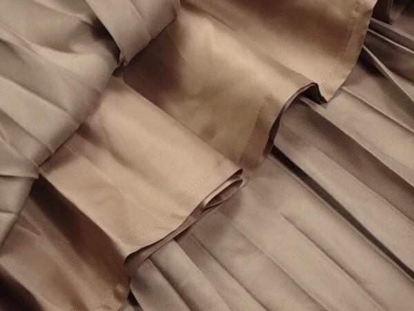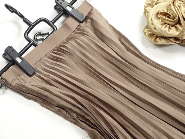 なめらかなサテン調素材の上質プリ-ツスカ-トです。風に優しくなびき、歩くたびに着る人の足元を美しく見せてくれる一着です。裏地付。左サイドファスナ-有。
