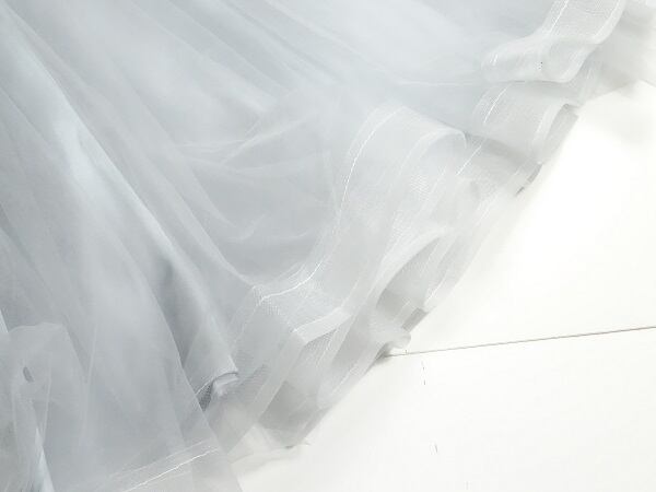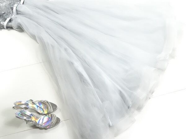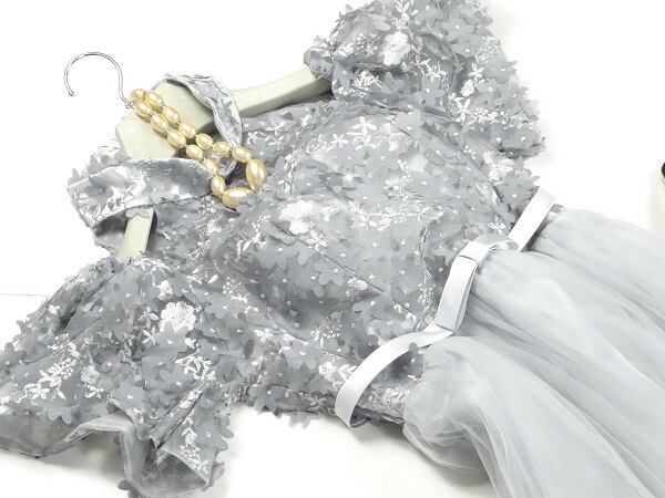 モチーフチュールのパーティーロングドレス。落ち着いたグレーのチュール地をたっぷり使用し、上半身にはチュール地にたくさんの同色の花のモチーフと艶のある糸で刺繍をあしらっています。襟はベルトカラータイプ。左右は袖との間異がオープンになっており、首から肩のラインを美しく見せています。袖もふっくらしたチュールにモチーフを飾り豪華な印象に。ウエストにはサテンの細いリボンベルトをあしらい、すそにかけてチュールがボリューム感をだし、豪華な印象に仕上げています。結婚式、パーティ、イベントなど華やかなシーンにぴったりの一着です。着脱は背中ファスナ-。裏地あり。