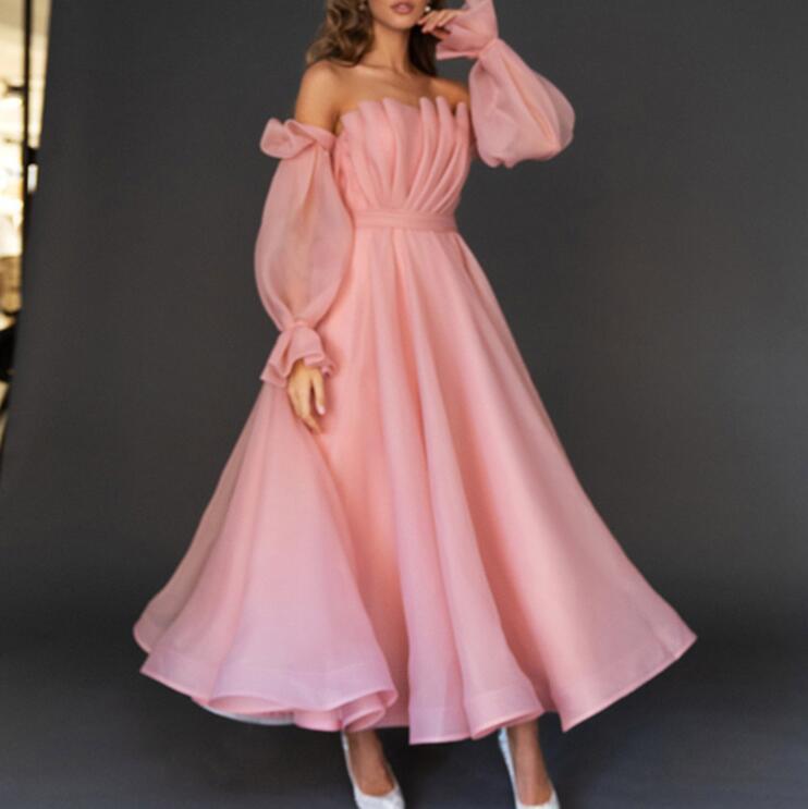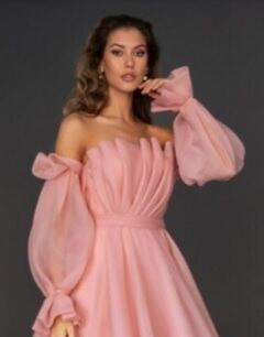 オフショルダ-パーティーミディアムドレスです。胸元はプリ-ツのセクシーな形。袖はたっぷりの生地を使用し袖先をきゅっと絞ったキュートなスタイル。気品のある印象に仕上がっています。パーティやイベント、結婚式など、様々なシーンで、気品のある印象を与えてくれる一枚です。背中ファスナー有。