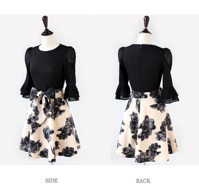 とても優美かつ綺麗な膝丈フレア-ワンピ-スです。ウエストから裾にかけてはたっぷりと生地を使用したフレア。袖のレ-スが女性らしいエレガントでフェミニンな一着です。背中ファスナ-有。裏地付。リボンベルト付。