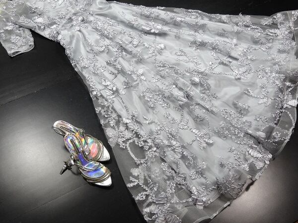 リボン刺繍のパーティ-ロングドレス。袖やデコルテの透け感がとても美しく大人の女性を醸し出してくれるエレガントなデザイン。全体にシルバ-系の立体刺繍が施されデザイン性のあるスタイルがとても魅力的な一着です。全体的に優しい感じに仕上げられています。背中ファスナ-有。胸パット付き。裏地有。