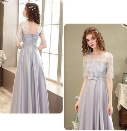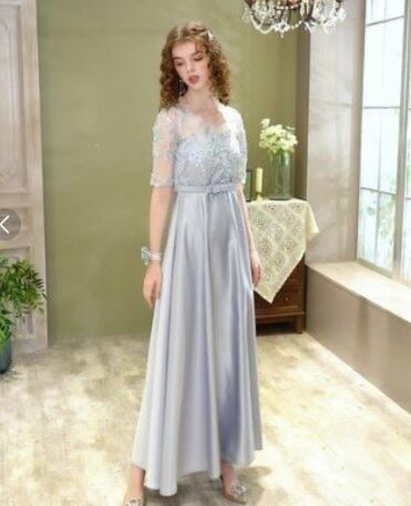 レース切替サテンロングドレスです。気品に満ちたとてもエレガントで上品なひとクラス上をいく一品です。トップス部分は立体刺繍が施されたレースがサテン地に重ねられ豪華かつ上品でエレガントなドレスです。背中網掛け。背中腰から下ファスナ-有。裏地有。胸パット付き。