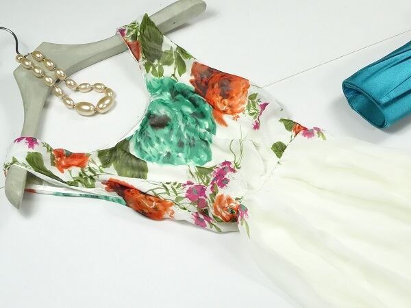 花柄プリントシフォンワンピ-スです。夏らしい明るい色の組み合わせで着心地抜群な素材でパ-ティ-はもちろんちょっとしたお出かけにもお役に立てる一着です。ファスナ-なし(かぶるタイプ)です。裏地付。