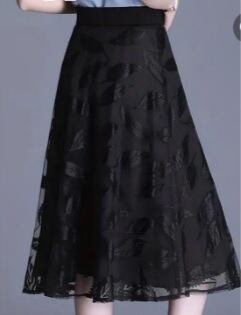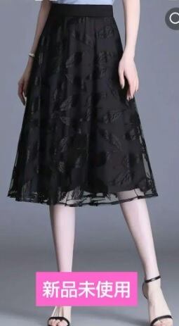 レース膝丈フレア-スカ-ト です。伸縮性のある黒のジャージ素材の上にボタニカル柄のレースをかぶせた仕様。ウエストは幅広総ゴム仕様なので、ウエストサイズにゆとりをもって着用いただけます。エレガントで揺れ感も素敵です。裏地有。ファスナ-なし。ウエスト総ゴム。