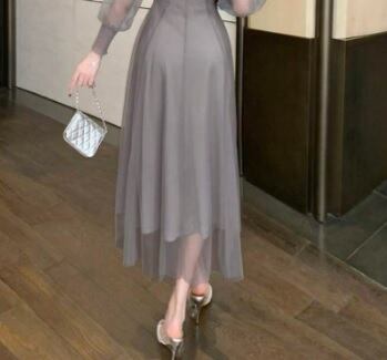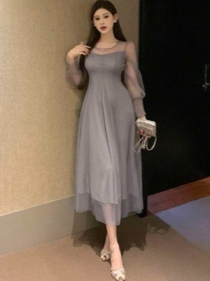 長袖シースルーチュールのワンピドレス。やさしいラベンダーグレーのチュールがふんわりと風になびくピュアでフェアリーなデザインです。たっぷりとしたチュールの袖がほんのりと腕の素肌をみせて、煌めく太陽の光の中でも、また新緑の爽やかな風の中でも、着る人を美しく魅せてくれる一着です。裏地は伸縮性のあるジャージ素材なので、着心地の良い一着となっています。裏地付き。左脇ファスナーあり。