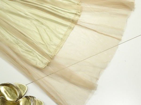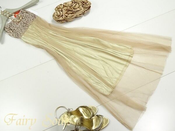 セクシ-マキシ丈のチュールワンピ-スです。胸元から下はふんわり豪華なチュールで、裾部分の透け感が程よくセクシー。着心地の良い一着です。ファスナ-なし(かぶるタイプ)。裏地有。