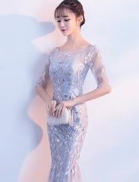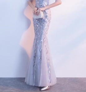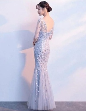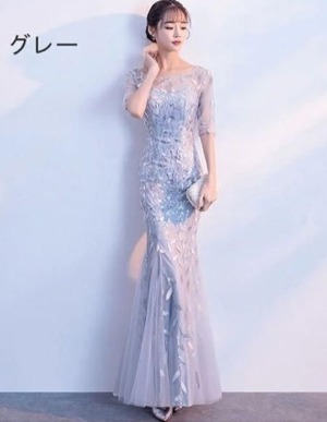 チュールのマーメイドドレス。サテン地に鮮やかな銀の小さなスパンコールをつなげた刺繍が施されたチュ-ルを重ねた豪華なデザイン。くびれたウエストがセクシーさを醸し出しています。パーティやライブ、イベントなど華やかなシーンに。デザイン上伸縮性はそれほどなく体のラインにフィットしたシルエットです。背中ファスナー有。裏地なし。胸パット有。