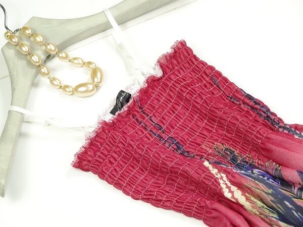 柄入りのキャミワンピースです。胸元はシャ-リングになっていて伸びます。ファスナーなしのかぶるタイプ。裏地有。