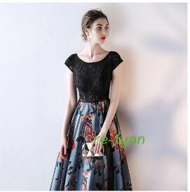 レース切替サテンチュールのロングドレス。気品に満ちたとてもエレガントで上品なひとクラス上をいく一品です。トップス部分は黒の花柄レース。ウエストから裾にかけてはクラシカルな花模様のプリントが施された灰青のサテン地の上にチュールを重ねた華かつ上品でエレガントなデザインになっています。パーティやコンサート、結婚式の二次会にと、様々な華やかなシーンで活躍してくれる一着です。背中は網紐掛けなので、紐の締め具合を調整することでサイズに余裕をもって着用いただけます。裏地有。胸パット付き。