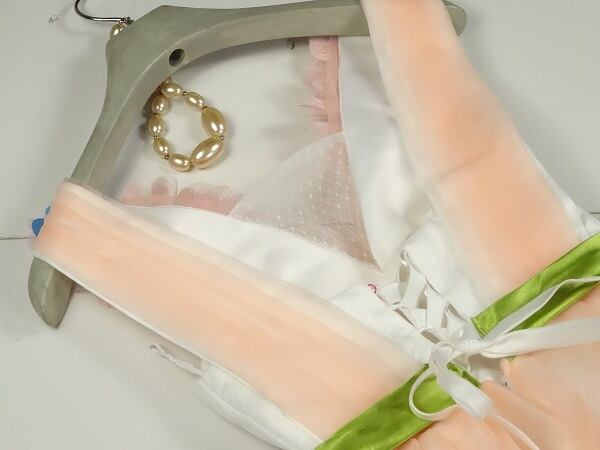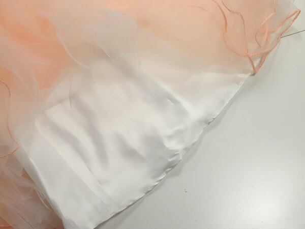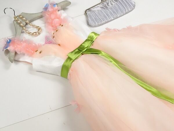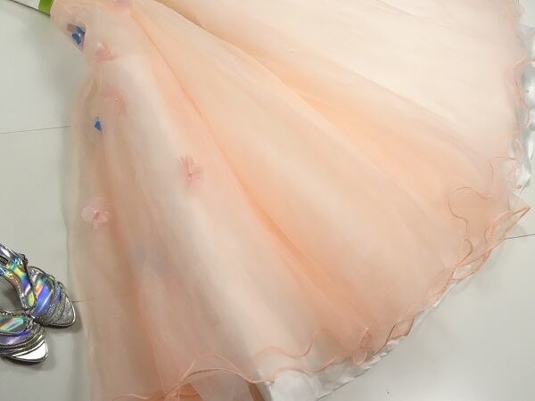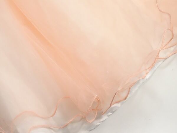 チュールのプリンセスパーティーロングドレスです。全体的に花びらがあしなわれウエストにはサテンの細いリボンベルトをあしらい、すそにかけてチュールがボリューム感をだし、豪華な印象に仕上げています。結婚式、パーティ、イベントなど華やかなシーンにぴったりの一着です。背中ファスナ-有。裏地あり。
