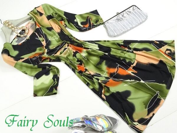 ジャージー素材墨染風長袖ワンピース。シックな色合いの墨染風の柄と、ウエストでドレープをとったデザインが、艶やかで洗練された大人の魅力を演出してくれる一枚です。伸縮性のあるジャージー素材なので着やすは抜群。ファスナーなしのかぶるタイプ。裏地なし。