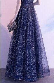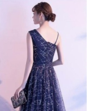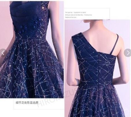 スパンコール飾りが美しいロングドレスです。たっぷりとした紺のサテン地の上に、スパンコールを張り巡らした紺のチュールをたっぷりと重ねたデザイン性のあるスタイルがとても魅力的です。肩紐があり胸元はしっかりとした固めのチュールを使用し、ずり落ちをカバー。豪華かつ上品で全体的に優しい感じに仕上げています。背中はファスナー仕様になっていて着やすいです。華やかなパーティシーンにぴったりの一着です。背中ファスナー仕様。胸パット付き。